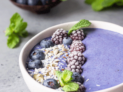 200g de mirtilos; 50ml de bebida de amêndoa sem açúcar adicionado; 3 colheres de sopa de granola...